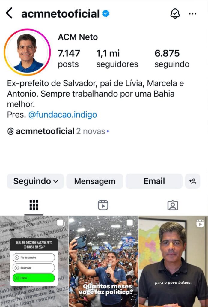 O  ex-prefeito de Salvador e presidente da Fundação Índigo, ACM Neto (União Brasil), é o único baiano presente no ranking dos 100 políticos mais influentes do Brasil no Instagram, divulgado pelas plataformas MonitoraBR e Zeeng e repercutido pelo site Bahia Notícias. O levantamento, com base em publicações feitas entre janeiro e junho deste ano, monitorou mais de 2,6 mil perfis políticos e levou em conta engajamento, alcance e influência no debate público digital.