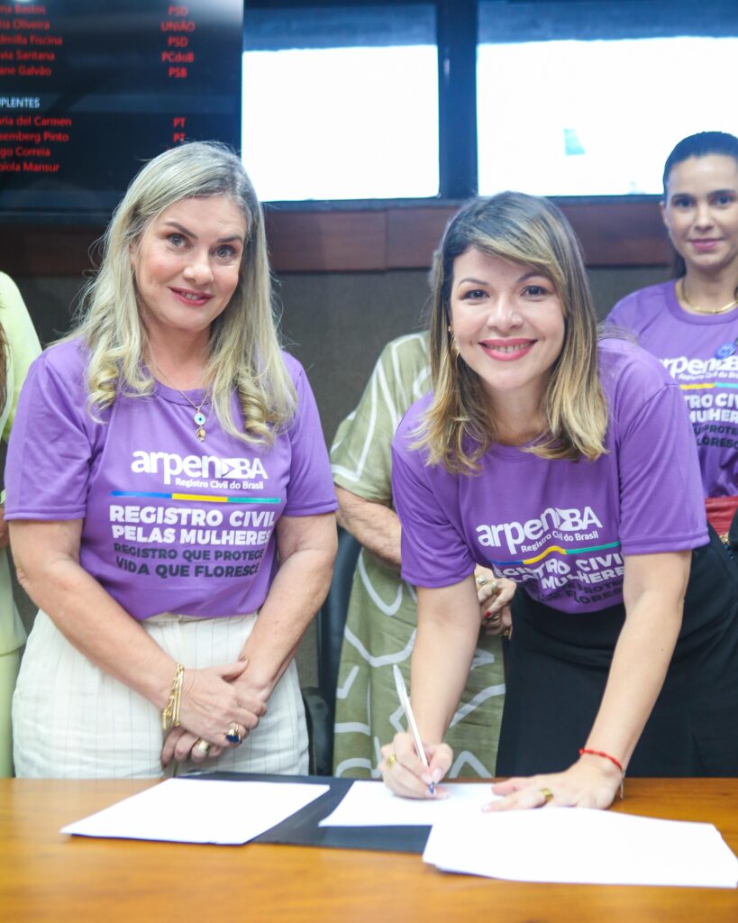 A Assembleia Legislativa da Bahia (ALBA) protagonizou, nesta quarta-feira (25), um marco histórico na defesa das mulheres baianas. A presidente da Casa, deputada Ivana Bastos, as parlamentares da bancada feminina e a Associação dos Registradores Civis das Pessoas Naturais do Estado da Bahia (Arpen-BA) assinaram um protocolo de intenções que assegura o acesso à cidadania e fortalece a rede de proteção a mulheres em situação de vulnerabilidade. A iniciativa foi apresentada sob o lema “Registro que protege e vida que floresce”.