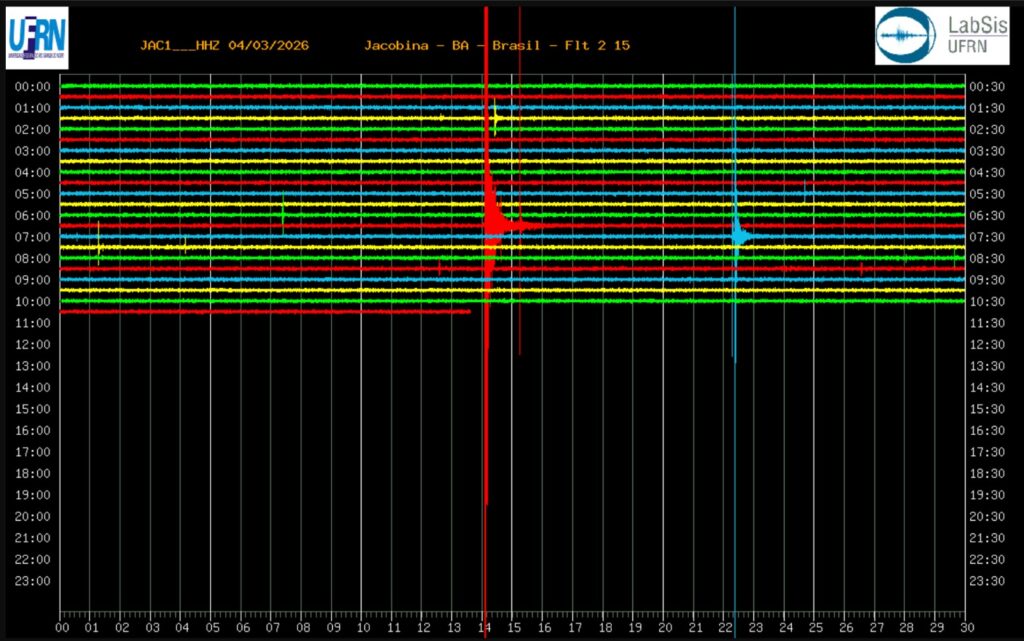 O registro da estação local do LabSis na região de Jacobina mostra, em um traço vertical vermelho, o momento do maior tremor da madrugada. Já o segundo abalo, de menor intensidade, aparece indicado em azul no gráfico. A Defesa Civil de Jacobina informou que está em contato com moradores para ouvir relatos e monitorar possíveis impactos.
