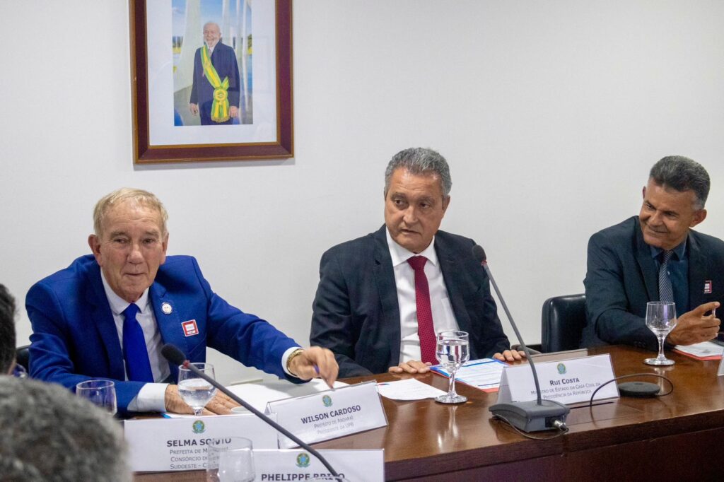 Os Presidentes da União dos Municípios da Bahia (UPB), Wilson Cardoso, e da FECBAHIA, Sivaldo Rios, apresentaram demandas dos municípios baianos ao Ministro da Casa Civil Rui Costa, em reunião com presidentes de consórcios públicos, nesta quarta-feira (21), na capital federal. No encontro, Rui Costa afirmou que o Governo Lula dará apoio à aprovação da PEC66, que tramita na Câmara dos Deputados.