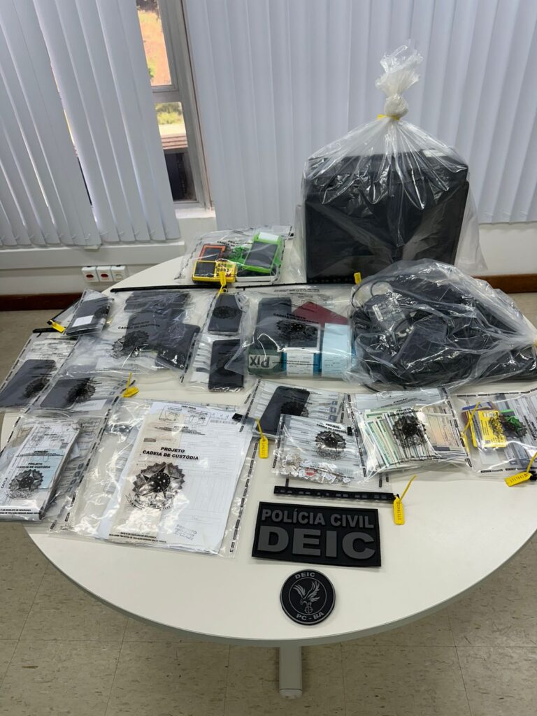 Durante o cumprimento dos mandados no povoado de Barra do Jacuípe, em Camaçari, e nos bairros de Matatu e Coutos, em Salvador, foram apreendidas 136 cédulas de identidade falsas, 11 máquinas de cartão, 20 cartões de crédito de terceiros, nove celulares, 110 chips, além de uma impressora e um notebook. Um dos alvos foi preso em flagrante com parte significativa do material.