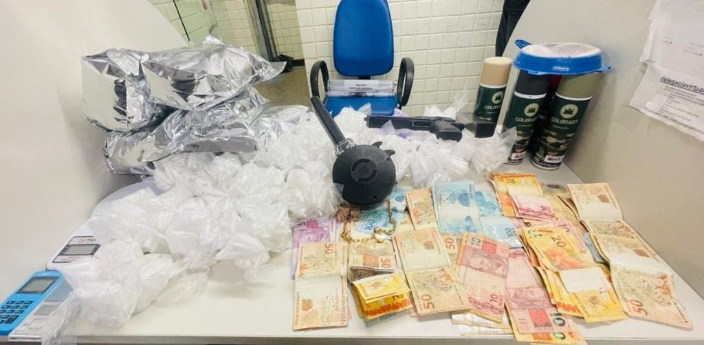 Na abordagem à edificação, foram apreendidos uma pistola falsa, um carregador caracol cal. 40, um carregador alongado cal. 9mm, 2.570kg de maconha Skank, 2.249 pinos de cocaína, quatro mil reais em espécie, uma corrente dourada, duas balanças de precisão, uma máquina de cartão e cinco latas de spray.