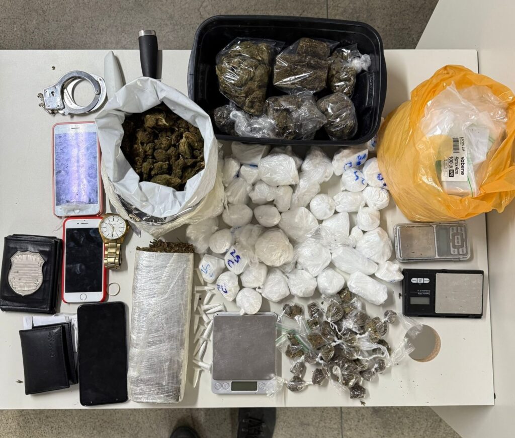 A equipe se deslocou rapidamente ao local informado, onde avistou dois indivíduos em atitude suspeita. Durante a abordagem, foram encontrados com eles, 56 porções de cocaína (aproximadamente 1,3 kg), 45 porções de maconha (aproximadamente 1,5 kg), além de duas facas, uma algema, três celulares, três balanças de precisão e um saco contendo sementes de maconha.