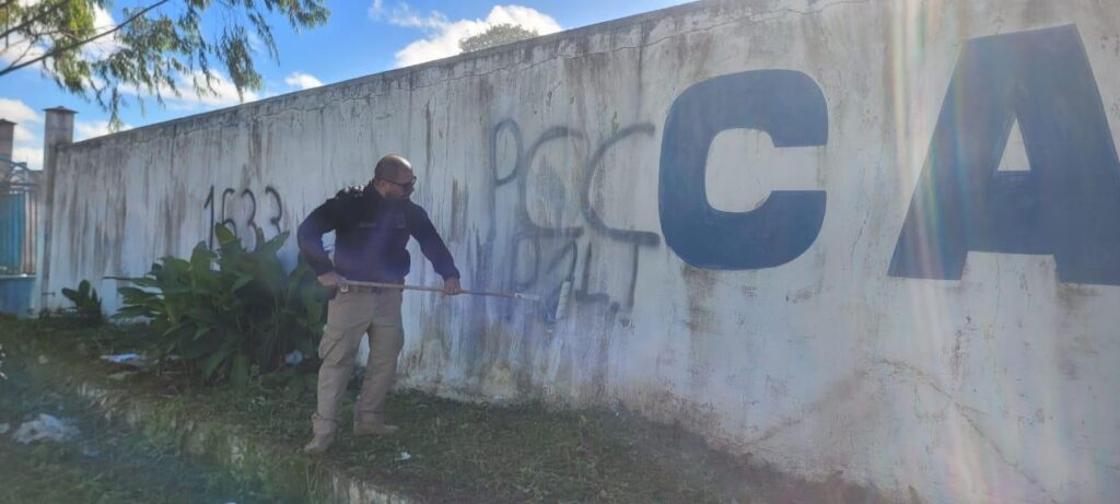A tentativa de demarcar território e fazer apologia ao crime foi alvo de uma ação conjunta da Polícia Civil, por meio da Delegacia Territorial (DT/Ibicuí), com a prefeitura, em diversos pontos da cidade, na quarta-feira (28). Durante a atividade de aproximação com as comunidades, pichações de siglas de supostos grupos criminosos foram encobertos com tinta.