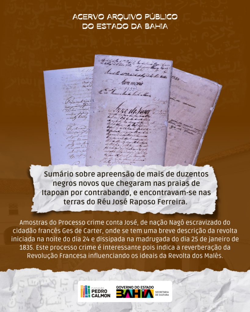 Os documentos digitalizados pelo APEB são referentes ao maço 2846, do Acervo Colonial, composto por amostras do Processo crime conta José, de nação Nagô, escravo do cidadão francês Ges de Carter, onde se tem uma breve descrição da revolta iniciada na noite do dia 24 e dissipada na madrugada do dia 25 de janeiro de 1835. “Este processo crime é interessante, pois indica a reverberação da Revolução Francesa influenciando os ideais da Revolta dos Malês”, sinaliza a Coordenação de Preservação do APEB.
